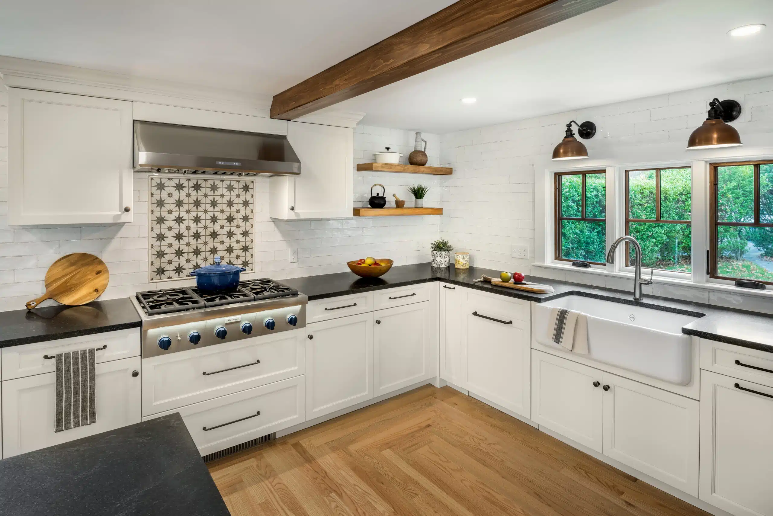 Originally built as a multifamily house in 1900, this New England residence in Tiverton, RI, was later converted into a single-family dwelling. Our client loved the quirky charm of her tiny kitchen, but the space felt disjointed and stuffy and didn’t fit the country-coastal aesthetic she envisioned for her retirement. The dated windows in her sunroom certainly didn’t do her sweeping bay views justice, either. Most important to our client, however, was to have a space she’d be proud to show off–especially when her son and his girlfriend came to visit. With this in mind, our team proposed a bold refresh of the kitchen and sun porch.