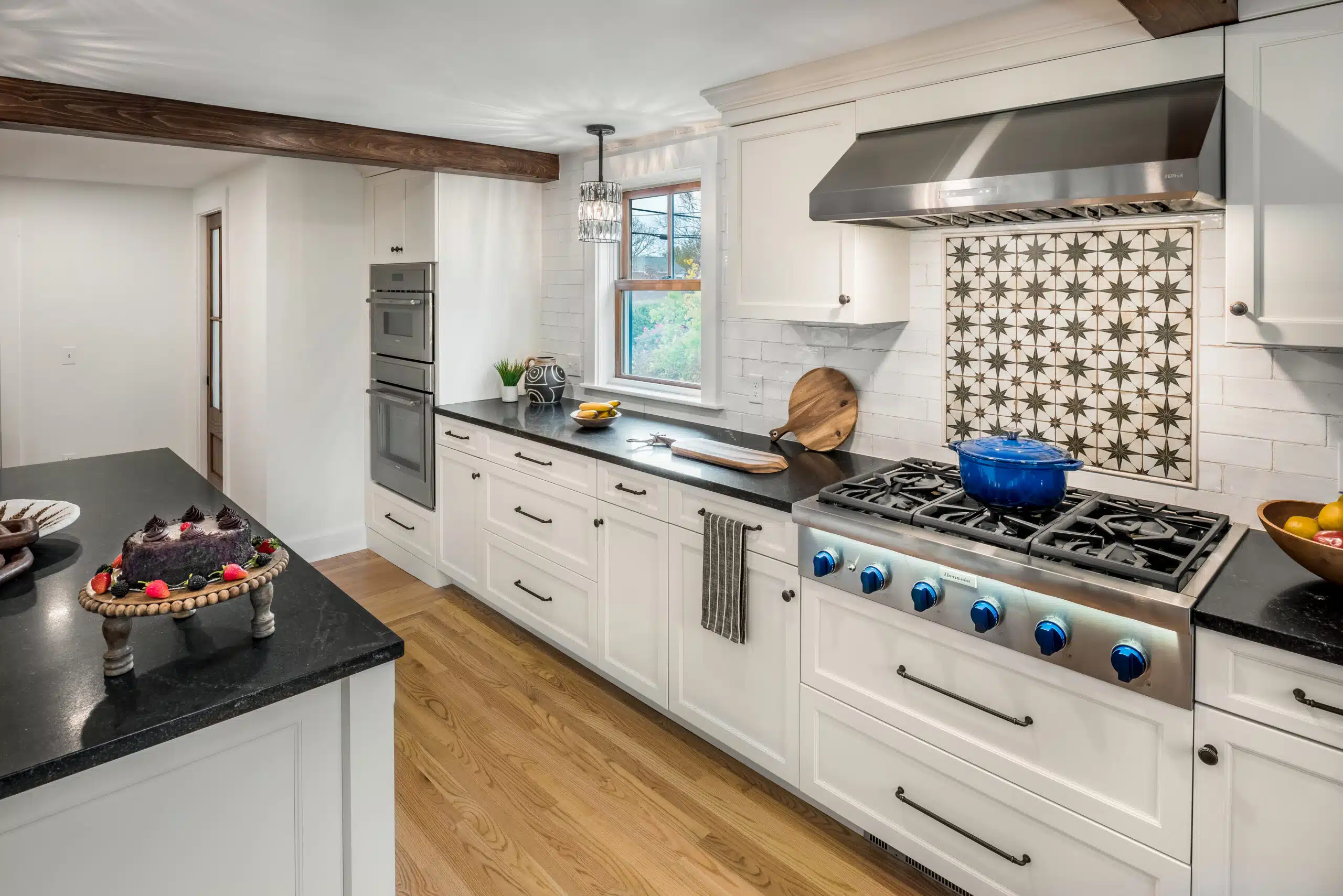 By strategically removing a disused chimney and the wall separating the dining room from the kitchen and relocating the kitchen powder room, our team was able to completely reenvision our client’s kitchen layout in a way that allowed for better flow, more space, and increased natural light. Now much more open and inviting, the updated kitchen features modern appliances, custom cabinetry, and a large sit-in island. Newly installed french doors and windows allow for beautiful views into the freshly renovated sunroom and beyond.