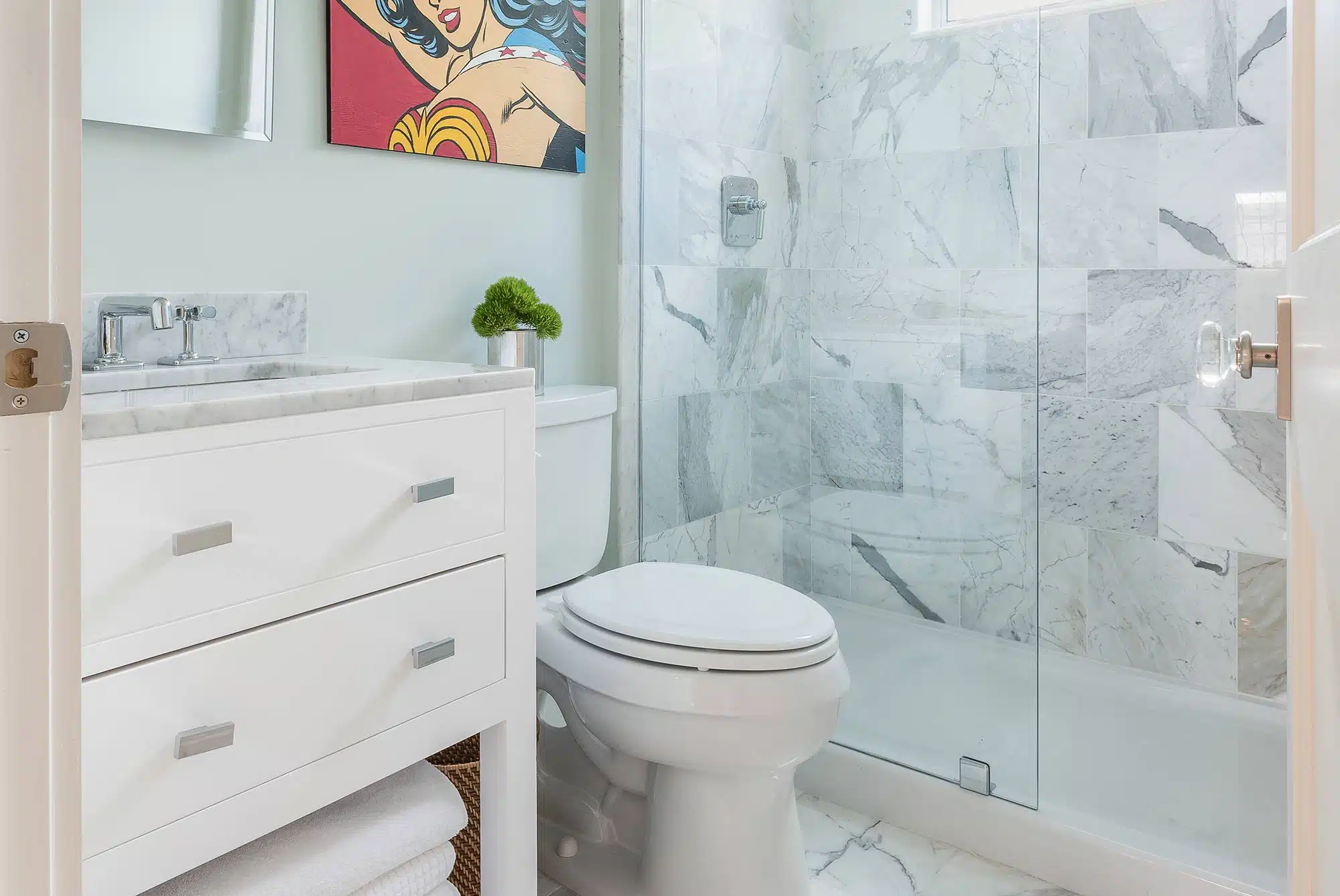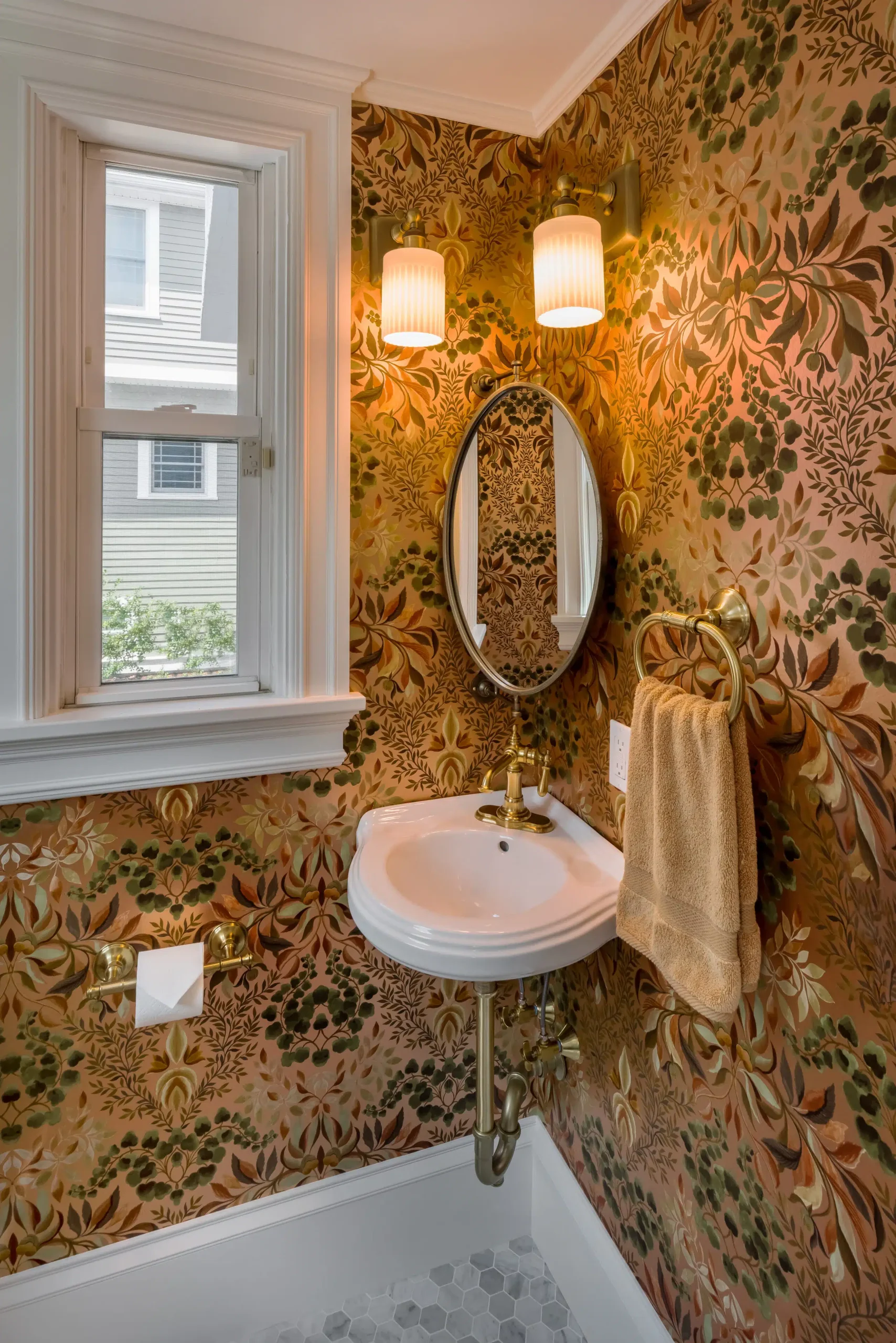 Adjacent to this beautiful kitchen is a completely reimagined mudroom and powder room bridging the transition from outside in. The slate tile pairs perfectly with the white built-in bench seating and floor to ceiling dresser. Before, this space was small and cluttered. Now it is their main point of entry and functions as the perfect place to prepare for a day out. Across from the mudroom, a beautifully styled powder room welcomes you. The copper floral wallpaper is a gorgeous and bold selection that truly marks the value of design collaboration. Added some copper and gold fixtures, this space takes on the perfect balance of traditional and modern.
