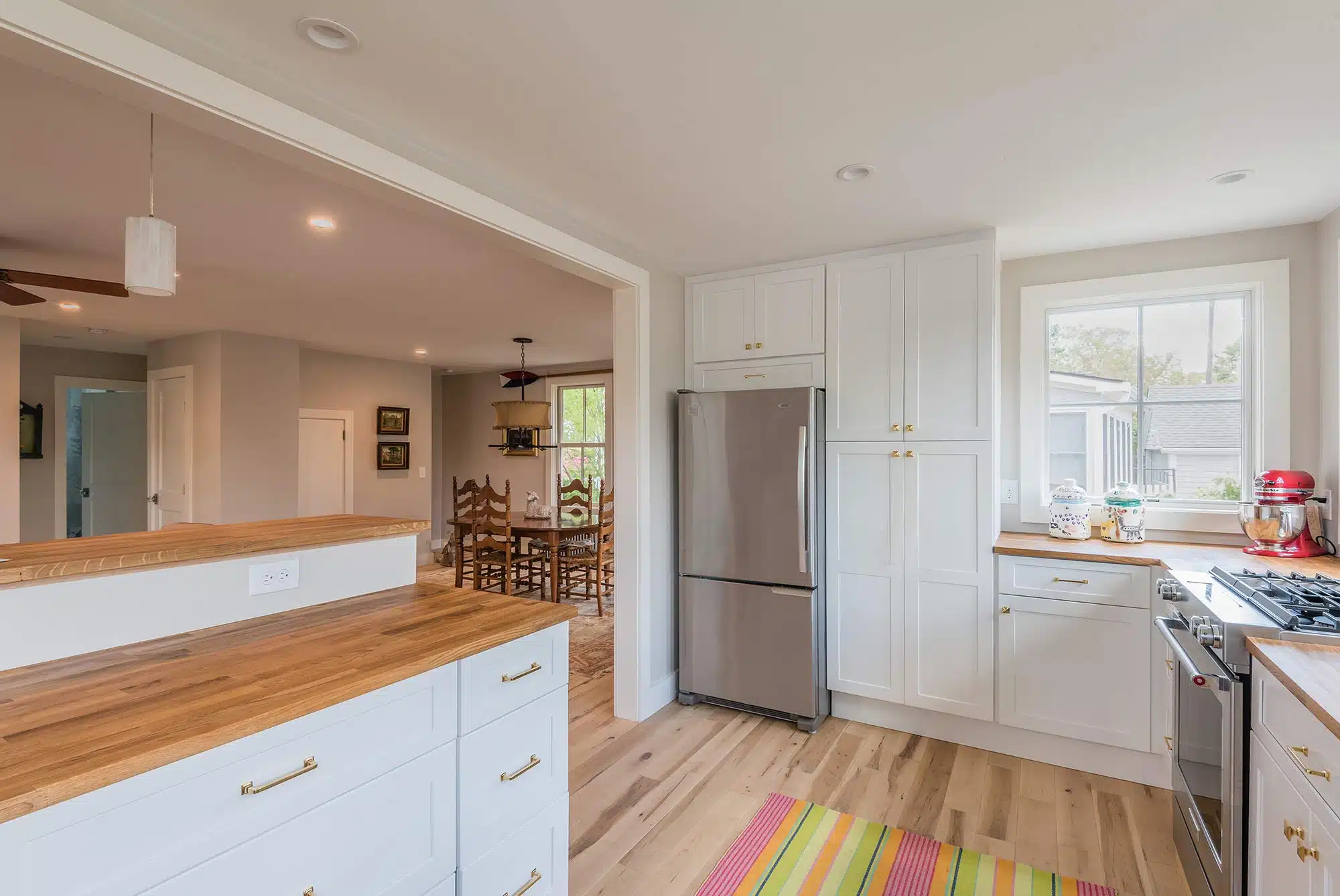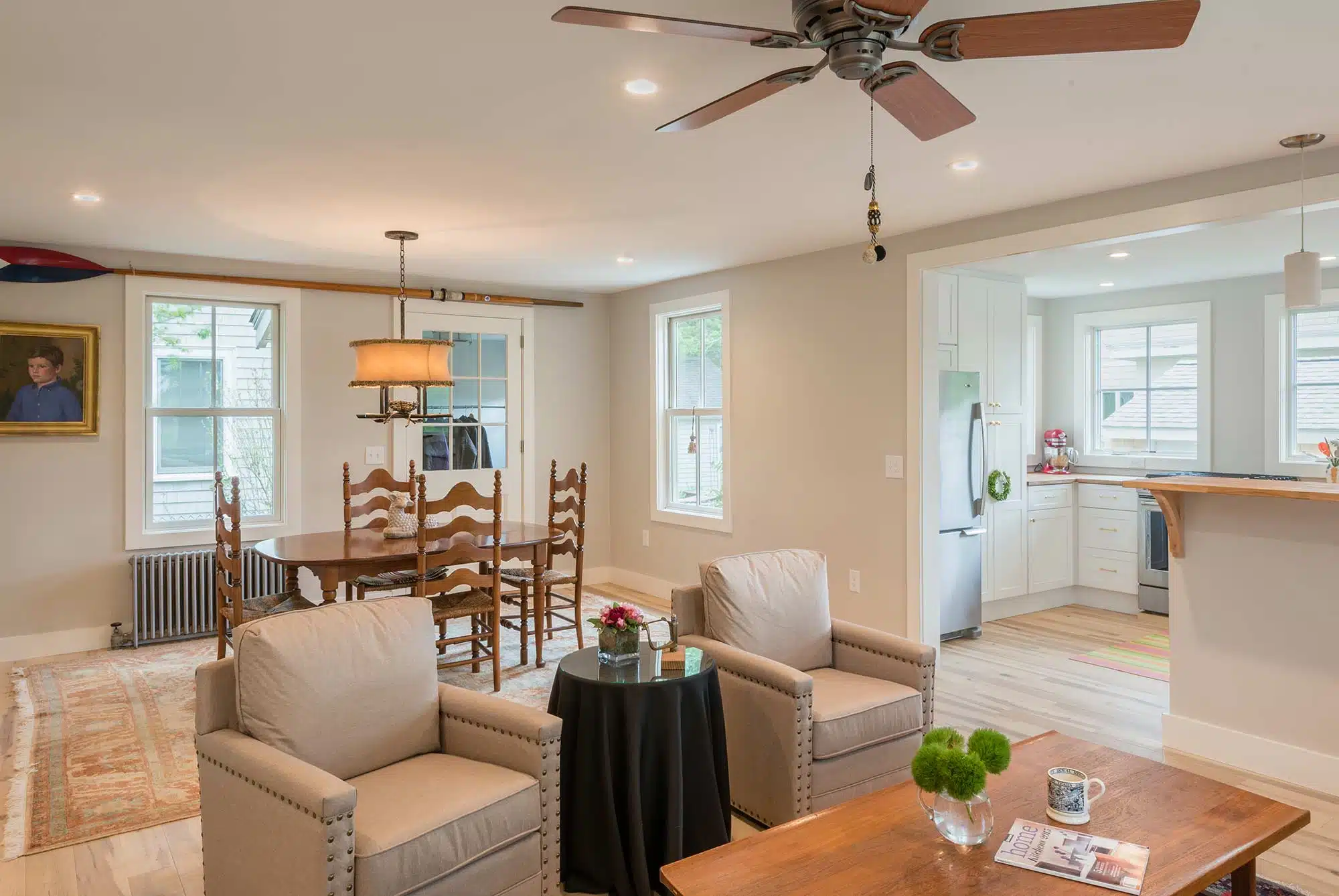 The Red House design team worked closely with the homeowner to redesign the home, opening up the main living space. The kitchen was moved from the original location into an existing small addition on the ocean side of the house. New windows, new interior trim, new doors, and new siding completed a thorough makeover for the home.
